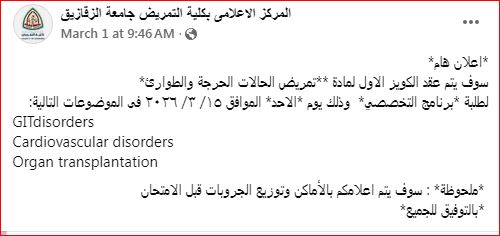 عقد *الكويز الاول* لمادة تمريض حالات حرجة وطوارئ نظرى *للبرنامج التخصصي* وذلك يوم *الثلاثاء القادم الموافق ١٨ / ٣ بالكلية