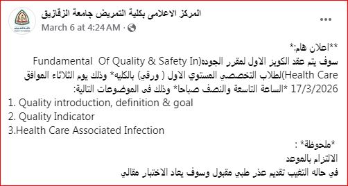 تحديد موعد الكويز الثاني لماده اساسيات الجوده والأمان في الرعايه الصحيه للبرنامج التخصصي المستوي الأول علي ان يكون يوم الثلاثاء الموافق 22/4/2025