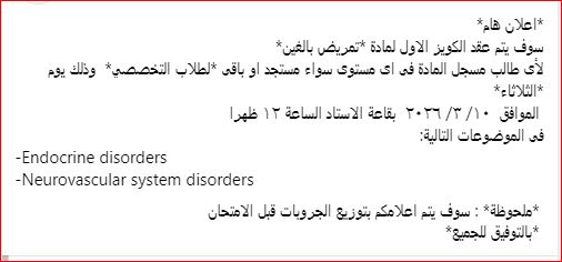 الكويز الاول* لمادة تمريض بالغين نظرى *للبرنامج التخصصي* وذلك يوم *الاثنين القادم الموافق ١٧ / ٣ /٢٠٢٥ الساعة الواحدة ظهرا بمدرجات الكلية